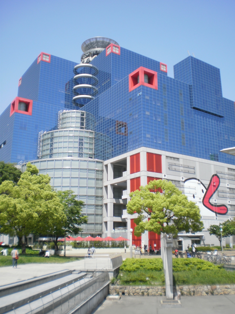 扇町公園の角に目立つガラス壁の大きな社屋があります。 大阪地下鉄の扇町駅でおりてすぐです。 壁面にはハチエモンが描かれていて楽しい感じです。 裏口から入ると、撮影した動画をアニメと合成したアトラクションがあり子供達が遊んでいました。
