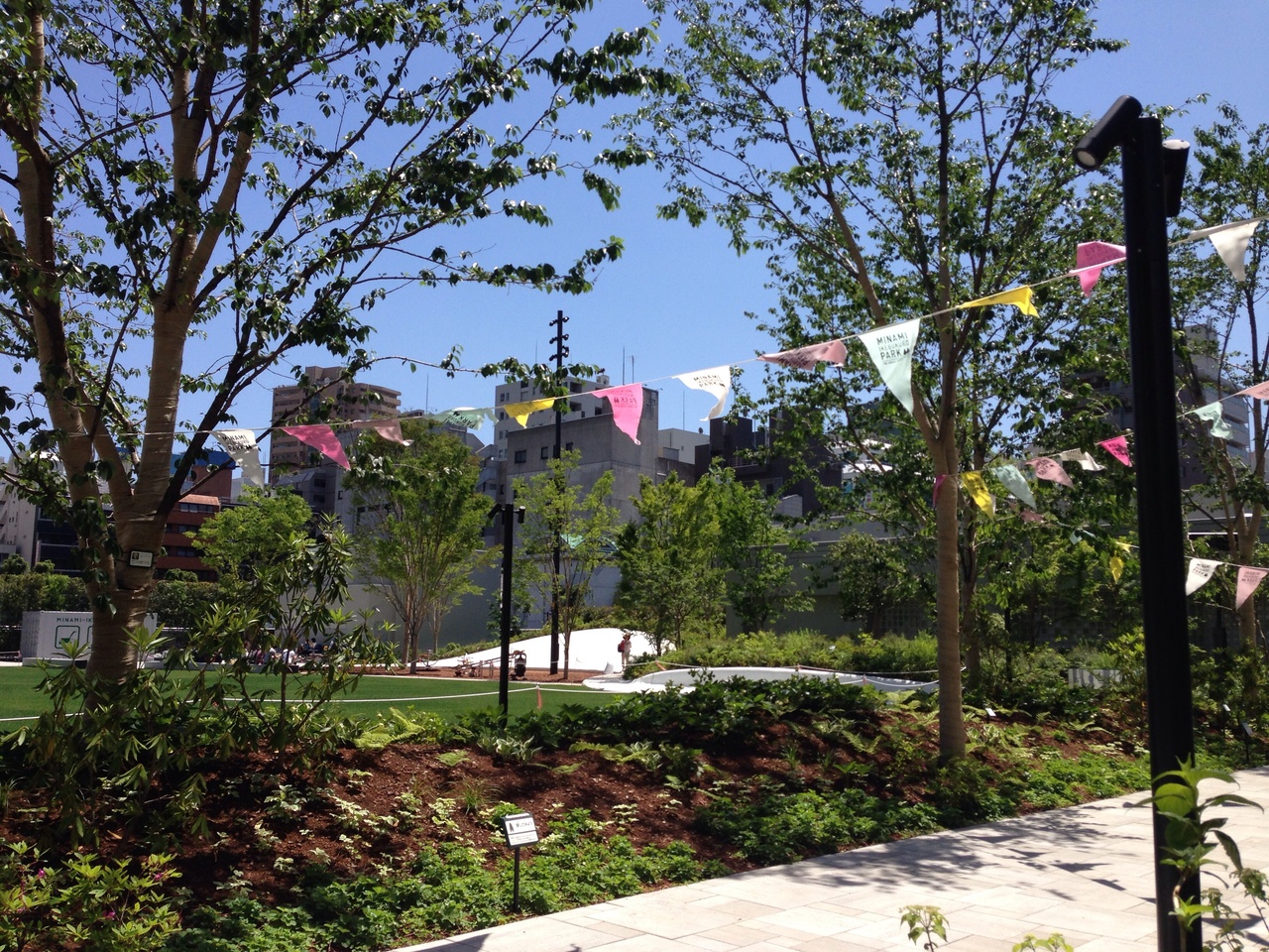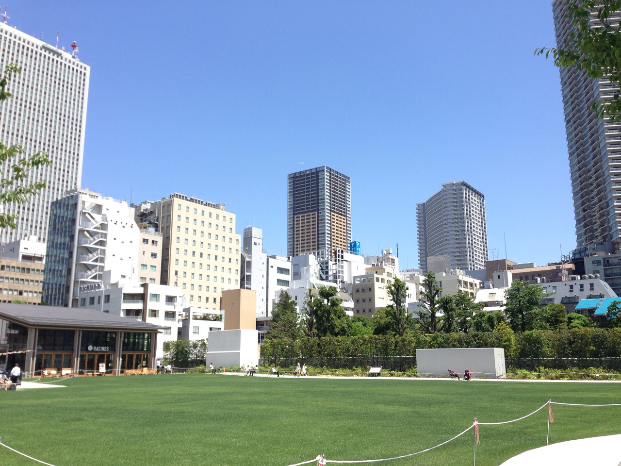 芝生はまだ養生中でしたが、周りのベンチや階段には 休憩する人がわんさか居ました。ビルとみどりの景色はまさに都会のオアシス、そりゃ人が多い訳です。