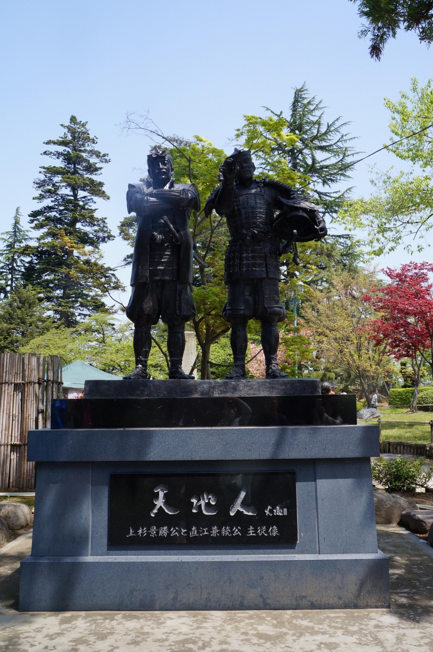 上杉景勝と直江兼続や「なせば成る なさねばならぬ・・・」の名言を残した上杉鷹山などの像の前を通って参拝。参道は決して広いとは言えません。歴史をあまり知らない私でもここはなんだかワクワクしました。神社の近くに物産館も併設されているのでいろんなお土産を一気に購入できます。