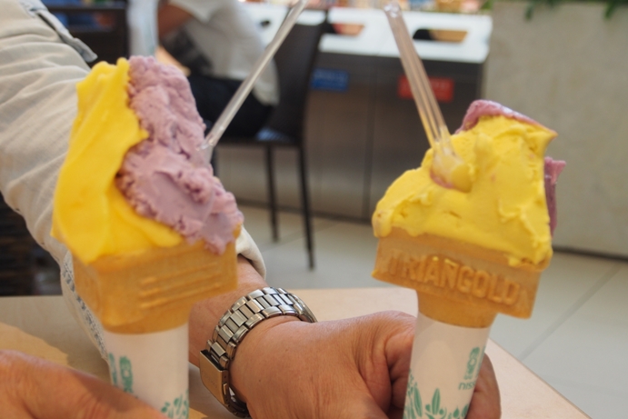 空港まで送ってくれたバスガイドさんお薦めの店でした。何を選ぼうかと迷ってしまいますね。欲張って2種類えらぶタイプにしましたが、私のあとにやってきた石垣の人らしい親子連れの小さな男の子が「マンゴーだけ」とおねだりしているのを聞いて「私もそうすれば良かった」と後悔しました。