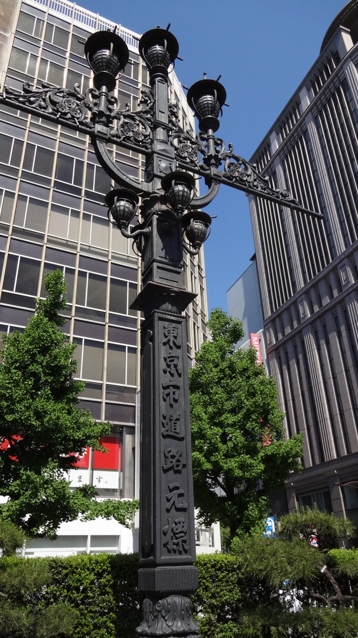 日本橋北側の西に立っています。道路の起点と終点をあらわす標識で、東京市道路元標はもと日本橋の中央にあり、東京都電の架線柱として利用されていたもので、昭和47年の都電廃止後、現在の位置に移されました。東京市道路元標の横には日本道路元標があります。字は時の総理大臣・佐藤栄作によるものです。日本橋の周辺はいろいろと歴史を物語るものがたくさんあります。