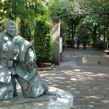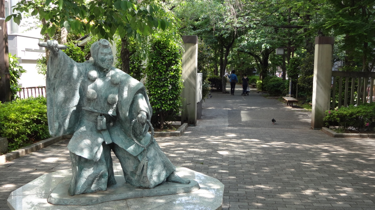 「人形町」駅と「浜町」駅のちょうど中間辺りに南北に延びる遊歩道です。ここにはかつて隅田川へ注ぐ浜町川が流れていましたが、今は暗渠となり、その跡地に遊歩道が整備されています。人形町は、江戸時代から歌舞伎の市村座・中村座や数多くの操り芝居や浄瑠璃の芝居小屋でにぎわっていた街であったことから、緑道にも歌舞伎の弁慶像と関所風の門が作られています。様々な木々が植えられ周辺住民や人形町や明治座に訪れた人々などが立ち寄り、憩の場となっているようです。