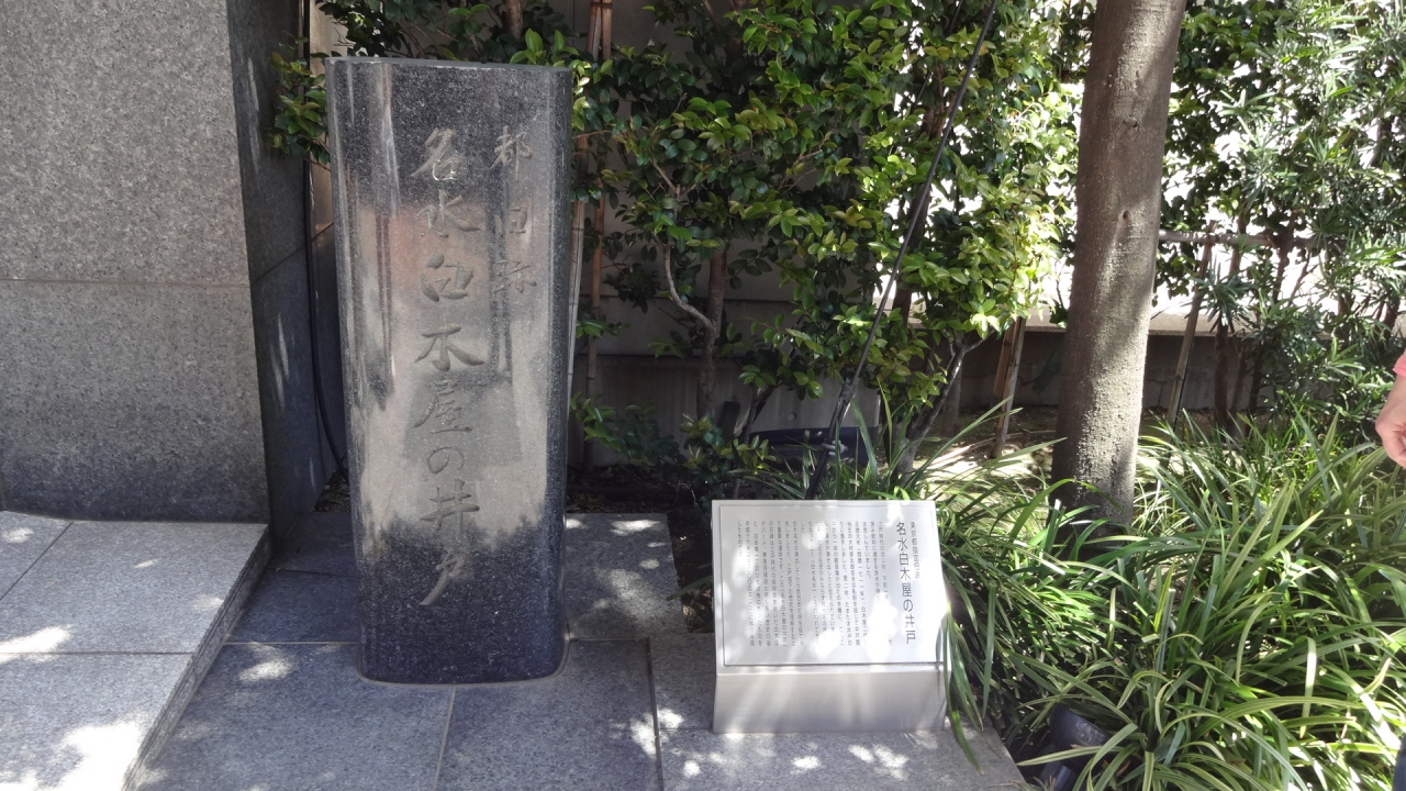 江戸時代初期、下町一帯の井戸は塩分を含み飲料に適する水が得られなかったため、白木屋2代目当主の大村彦太郎安全は、私財を投じて井戸を掘りました。たまたま井戸の中から1体の観音像が出たのを機に、清水がわ湧き出し、以来、付近の住民や諸大名の用水となって広く「白木名水」と言い伝えられてきたそうです。日本橋1丁目交差点角にあったものを平成16年(2004年)ここに移設したものです。