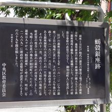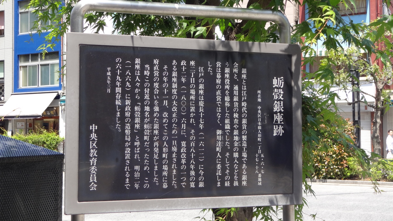 東京メトロ「人形町」駅の出口前、人形町通りと甘酒横丁の交差点の歩道に案内板が建っています。銀座とは江戸時代の銀貨の製造工場と銀貨の検査や銀地金の購入などを扱う銀座役所を総称した組織でした。 当時の地名が蛎殻町だったため、この銀座は人々から「蛎殻銀座」と呼ばれ、明治2年に新政府の造幣局が設置されるまでの69年間存続したとのこと。蛎殻町は、もとは漁師の小網の干し場であり、牡蠣の殻が堆積した海浜であったことに由来した町名だそうです。