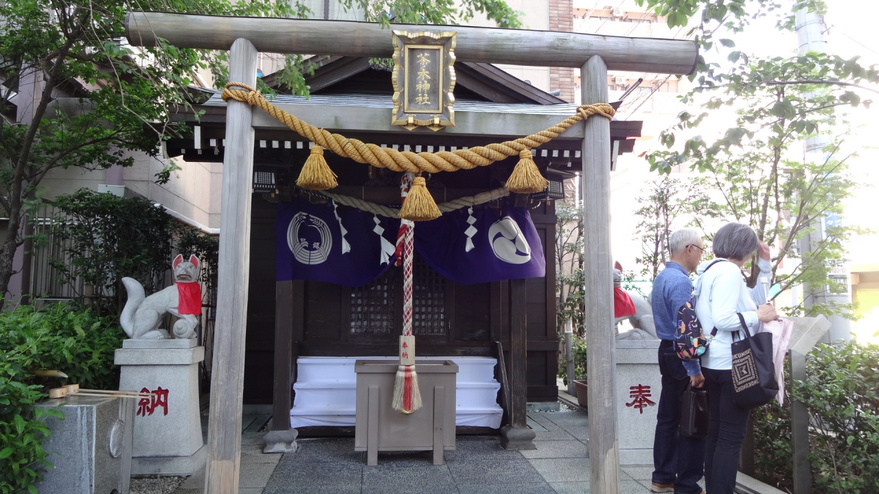 「水天宮前」駅そばにそびえ立つ高層マンションの脇にひっそりと鎮座しています。社の左右には茶の木が植えられており、八十八夜前後に茶摘みの体験も出来るようです。茶の木神社は日本橋七福神の「布袋様」です。また、火伏せの神としても信仰を集めています。