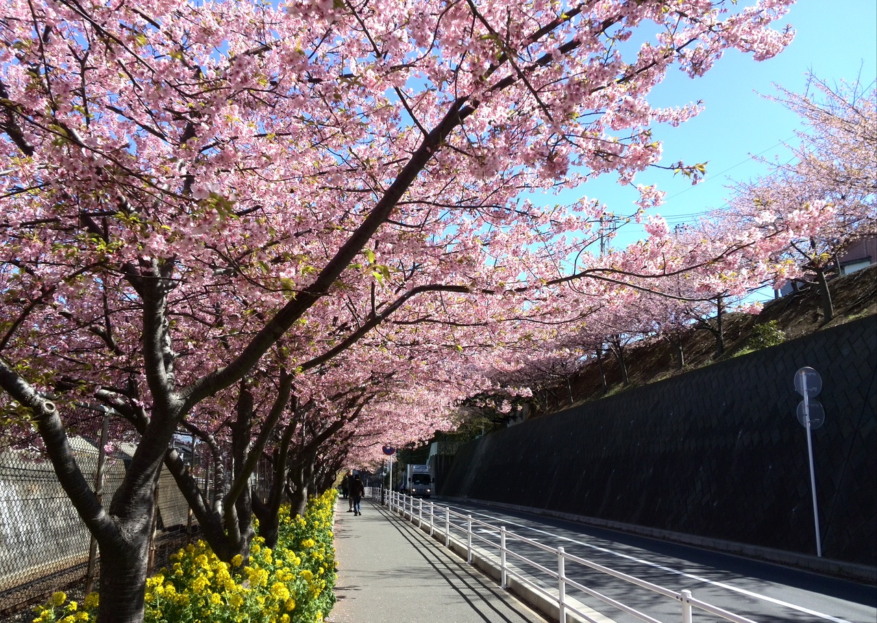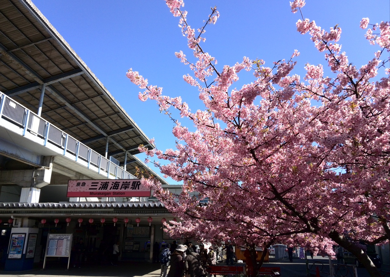 京急三浦海岸駅を出ると満開の桜