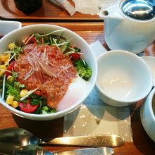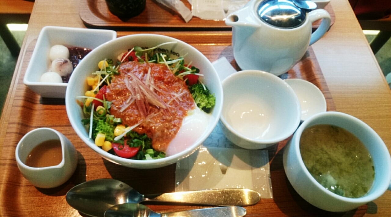 こちらのお店の前を通るといつも女性客ばかりという印象です。今回休日ということで、女性客で全部埋まっていました。まずレジで注文してから席に座るシステムのようです。今回は何種類かあるどんぶりランチの中で、タコライスにしました。友人は鶏そぼろにしていました。セットドリンクは宇治煎茶、友人はグリーンティーにしていました。抹茶やお茶のメニューが豊富なので(ドリンクからスイーツまで)、お茶好きな人には良いですね。ランチは、どんぶりとお味噌汁、ドリンク、デザートが付いて1200円前後でした。お味は美味しかったです。ただ、店内は女性客ばかりなためかかなり賑やかで、向かい合って座ってる友人の声すら聞き取りにくく、声を張って喋らないとないので疲れました。ゆっくり話したい方には向かないと思います。