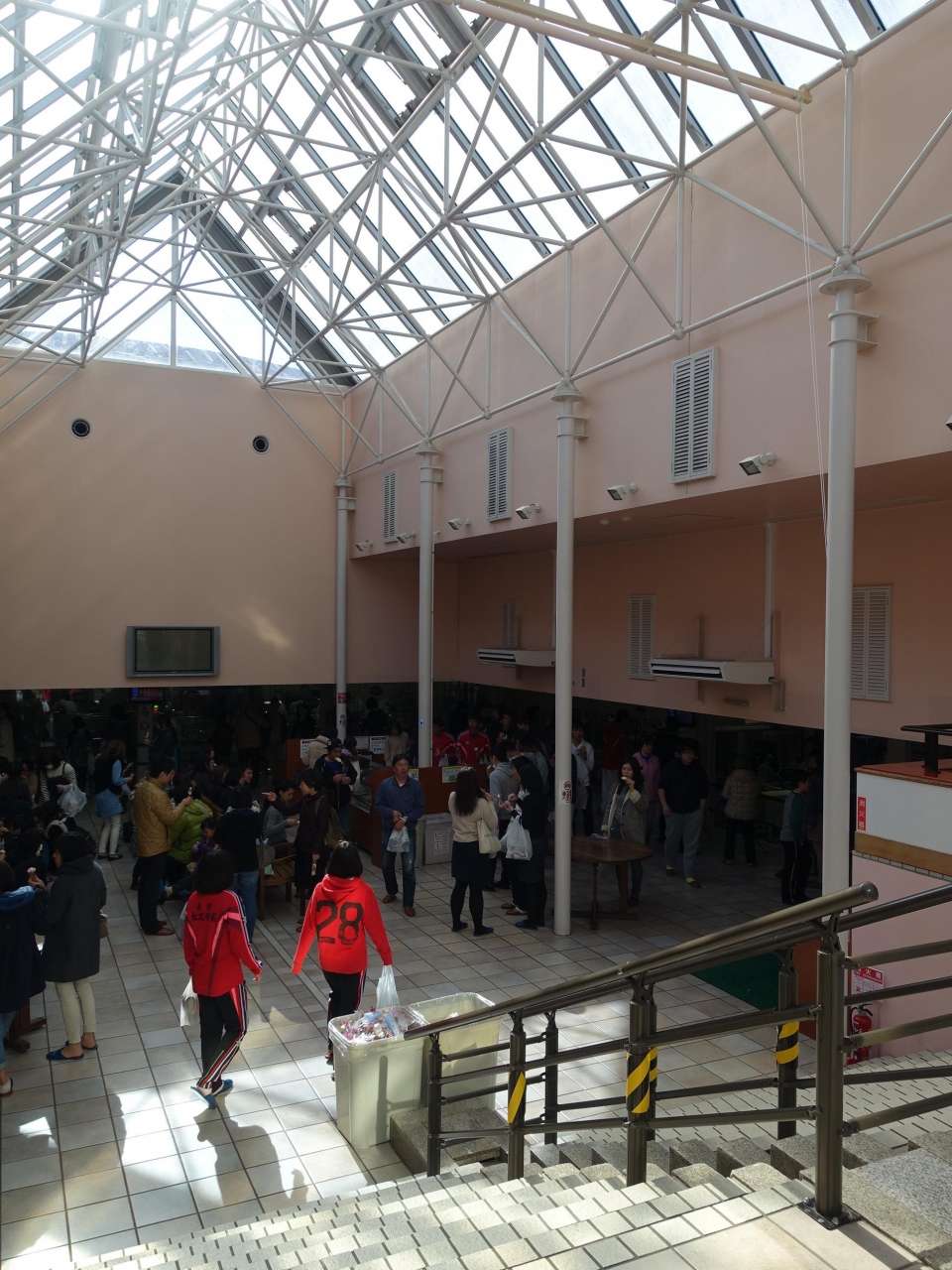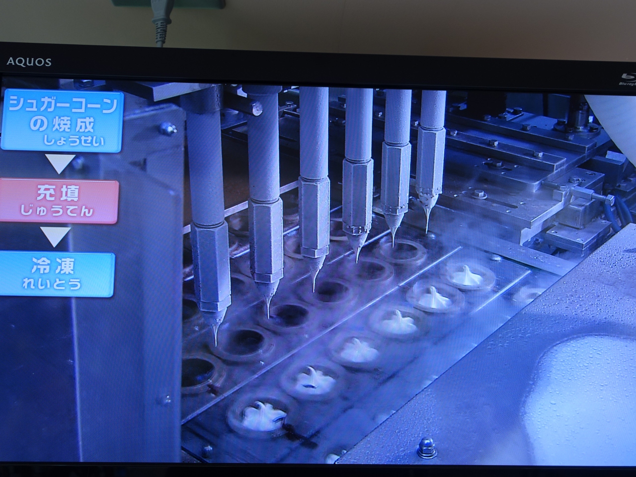 見学はフリーでした。靴をビニール袋に入れて、工場の廻りを一周しますが、途中に工場内生産ラインが見渡せるアイスクリーム食べ放題コーナーがあり、人だかりです。