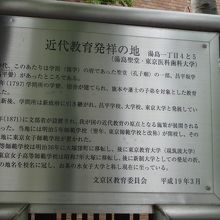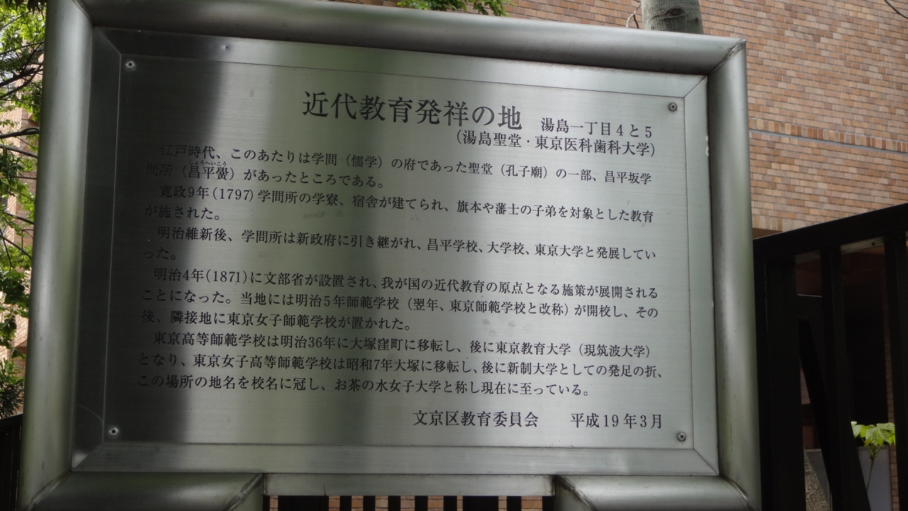 JR中央線「お茶の水」駅下車「聖橋」を渡って北端にこの碑が建っています。林羅山を祖とする私塾は、幕府直轄学校「昌平坂学問所」となりました。東京大学はその流れをくみます。明治時代になり、昌平坂学問所が廃止された後は、その敷地(現在の東京医科歯科大学)には、東京師範学校、東京女子師範学校が設置されました。そして、それぞれ、筑波大学、お茶の水女子大学へと発展していきました。また、 国立博物館、文部省もこの地からスタートしています。このような歴史があって、ここ、お茶の水周辺に、大学が集中していることに、合点がゆきました。