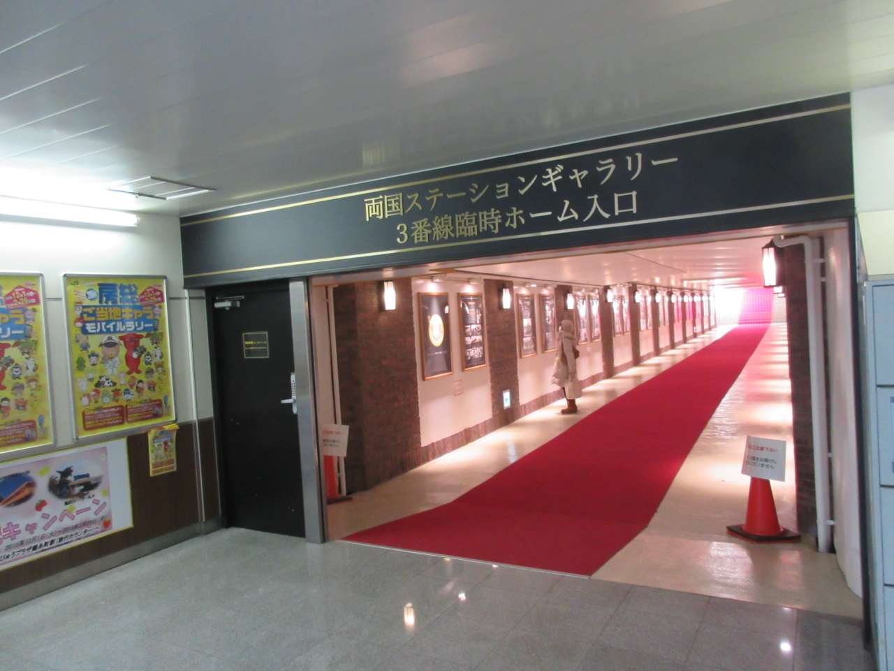 両国駅に、「両国ステーションギャラリー」が出来ていました。壁の両側に、駅や列車の歴史がパネルが展示されています。そして、「3番線臨時ホーム入り口」とあります。ここから臨時の観光電車が出るのでしょう、昔の両国駅はここから房総方面の列車が出ていました。