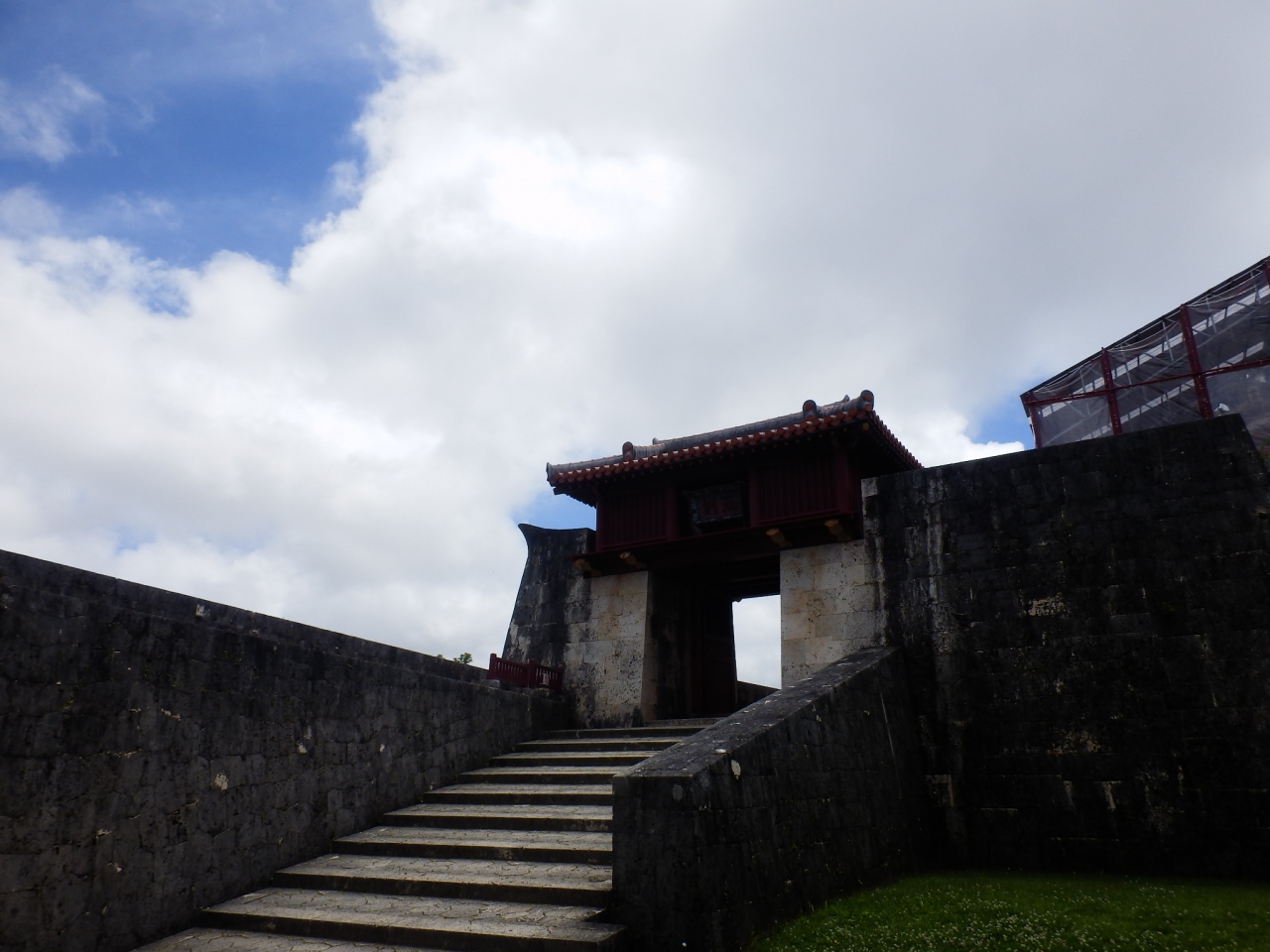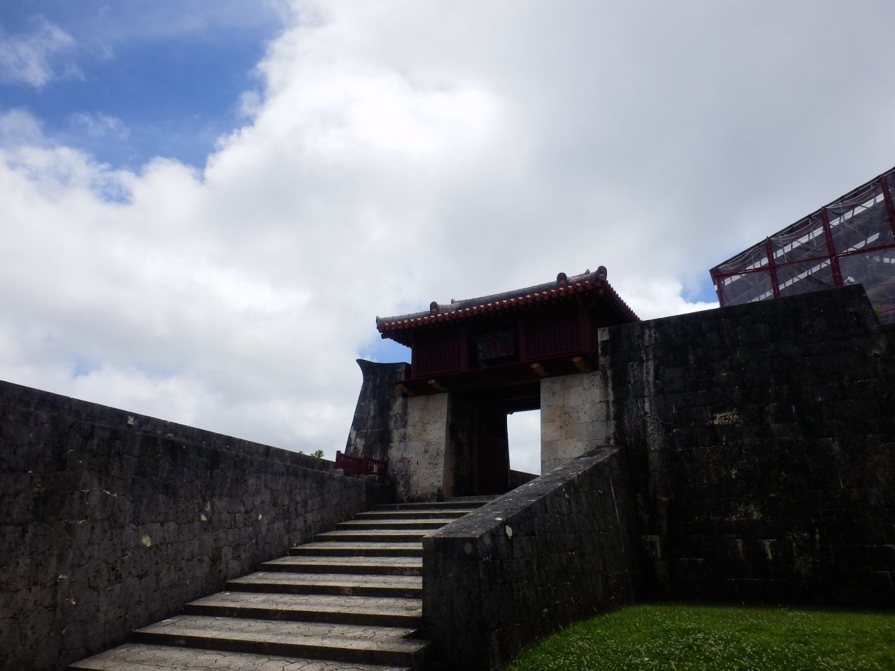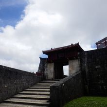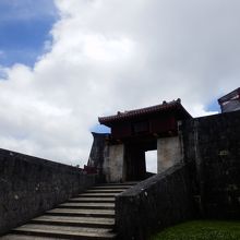 首里城正殿まではもう一息という場所に漏刻門はあります。しかし、ここの門にたどり着くまでの坂と階段が結構急できついのです。