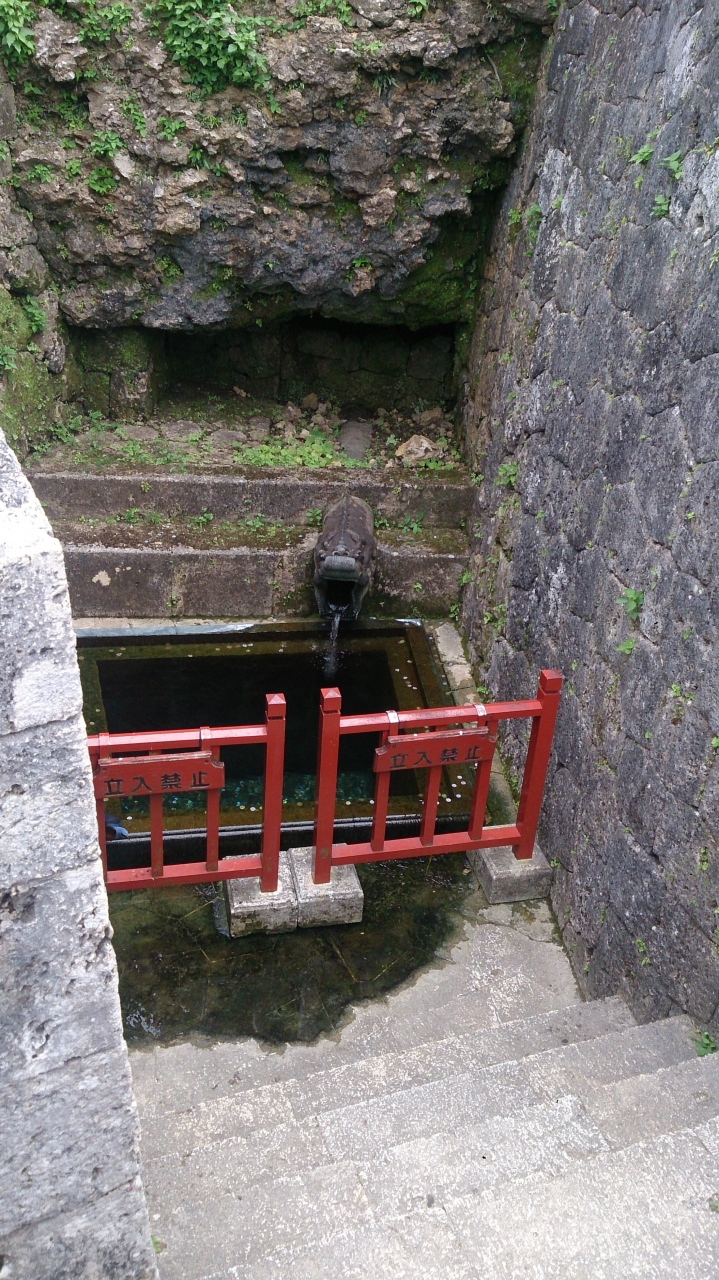 首里城公園のメインゲートである、駐車場・バス停のところから守礼門、歓会門を通って首里城の方に進むと石組みの階段があってそのわきに、こちらの龍樋があります。透明の水が龍の口から注がれており、意外なほどきれいな感じです。この龍樋も沖縄戦で破壊されてしまい、1996年に復元されたものです。首里城の正殿へのルート上にあるので、特に意識して立ち寄ることなく見ることが出来ます。但し、石段のすぐわきにあるので小さいお子さんや足腰に自信がない方には億劫かもしれません。
