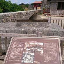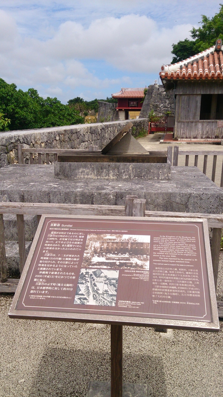 首里城公園に入り、正殿に向かって守礼門、歓会門、瑞泉門、漏刻門とメインルートを辿ってきて、漏刻門を抜けると正面にあります。首里城公園のなかでも1・2番に見晴し良い場所で那覇の街が遠くまで見渡すことが出来る場所です。この日影台には日時計が設置されております。この日時計は漏刻門の櫓の中にあった水時計とともに首里の時を刻んでいたものです。沖縄戦で破壊されたものを2000年に復元した時計になります。見た目はかなり大きな日時計です。