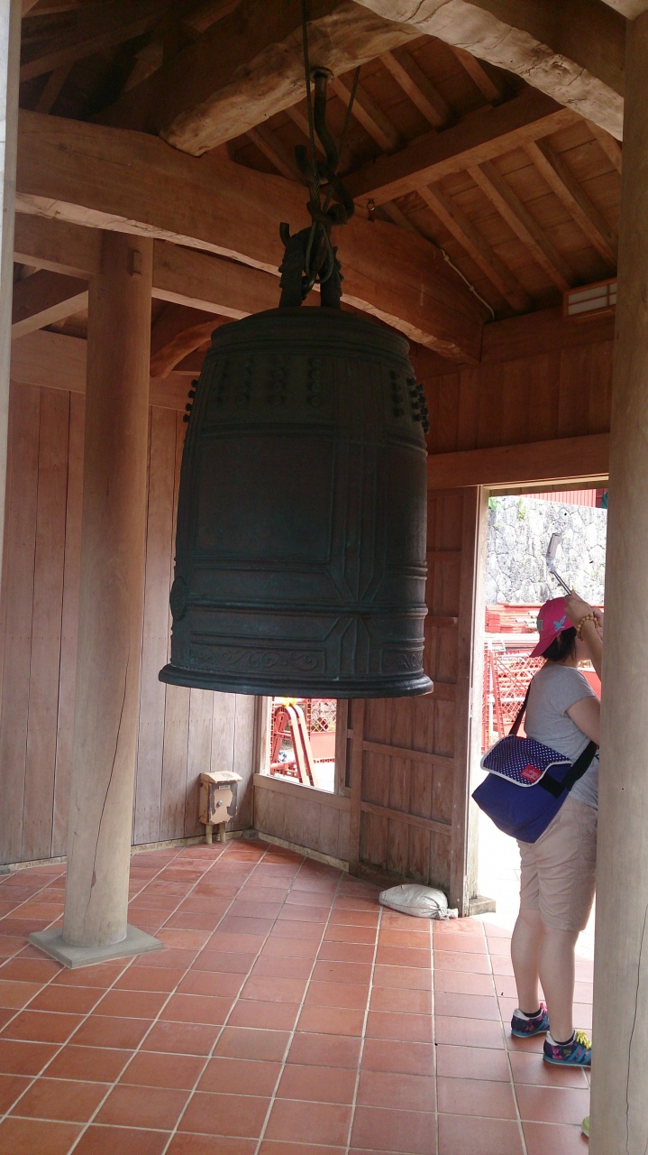首里城公園の最頂上部に近い場所にあります。漏刻門を抜けると、日影台があってその奥にあります。また、広福門の前になります。1458年につくられた鐘は銅製で首里城正殿の前にあったもので、万国津梁とは世界の懸け橋という意味です。現在、この地にあるものは2000年に復元されたレプリカでオリジナルの物は沖縄県立博物館に所蔵されています。鐘が設置されている供屋ですが、本州で見る鐘楼とはずいぶんと違っていて普通の建物です。