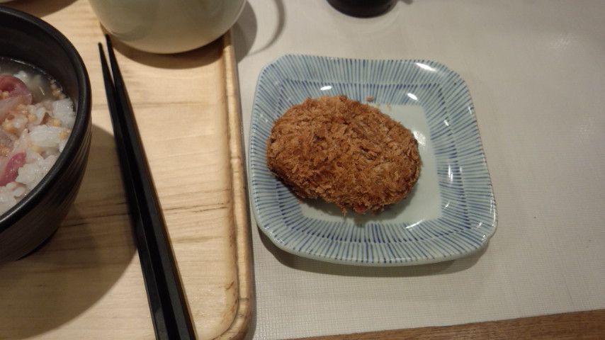 ルミネ新宿店へ行った3日後、会社の帰りに渋谷東急フードショー店で夕食をいただきました。平日の午後7時頃でしたが、思ったほどの混雑ではなく、落ち着いて食事をすることができました。この日は「鯛」と「焼き鮭といくらの親子だし茶漬け」のハーフ&ハーフをチョイス、追加でコロッケも注文しました。お茶漬けは2種類ともとてもおいしく、コロッケもまずまずの味でした。ご飯を大盛りにしてサイドメニューを加えればボリュームも満足、立地もよいので、今後「えん」には頻繁に来ることになりそうです。