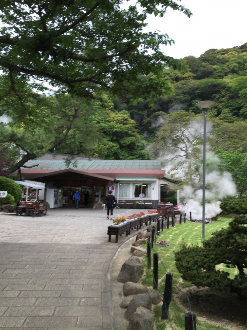 海地獄池の周りを歩いてみると温泉蒸気が冷えて霧状に降ってるところがあります。