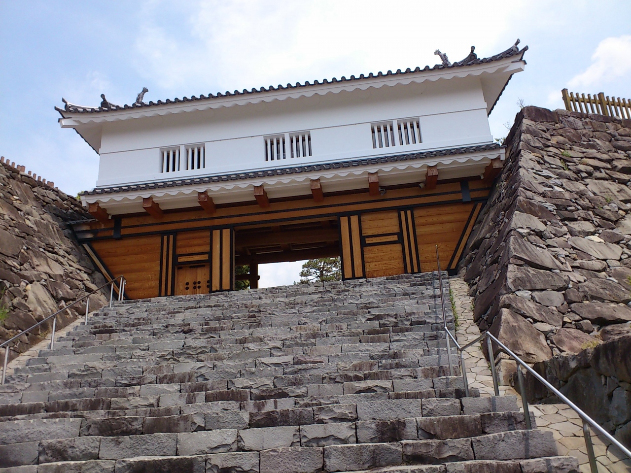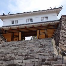 甲府城跡の舞鶴城公園に遊亀橋を渡って入り、日本庭園を眺めた後に立派な石垣に沿って石段を上がっていくと、真新しいですがとても立派な門が現れました。門をくぐって石垣を上がると展望所のような場所があり、素晴らしい眺めです。門の2階の中にも入ることができます。門の再建時の写真などが展示されています。