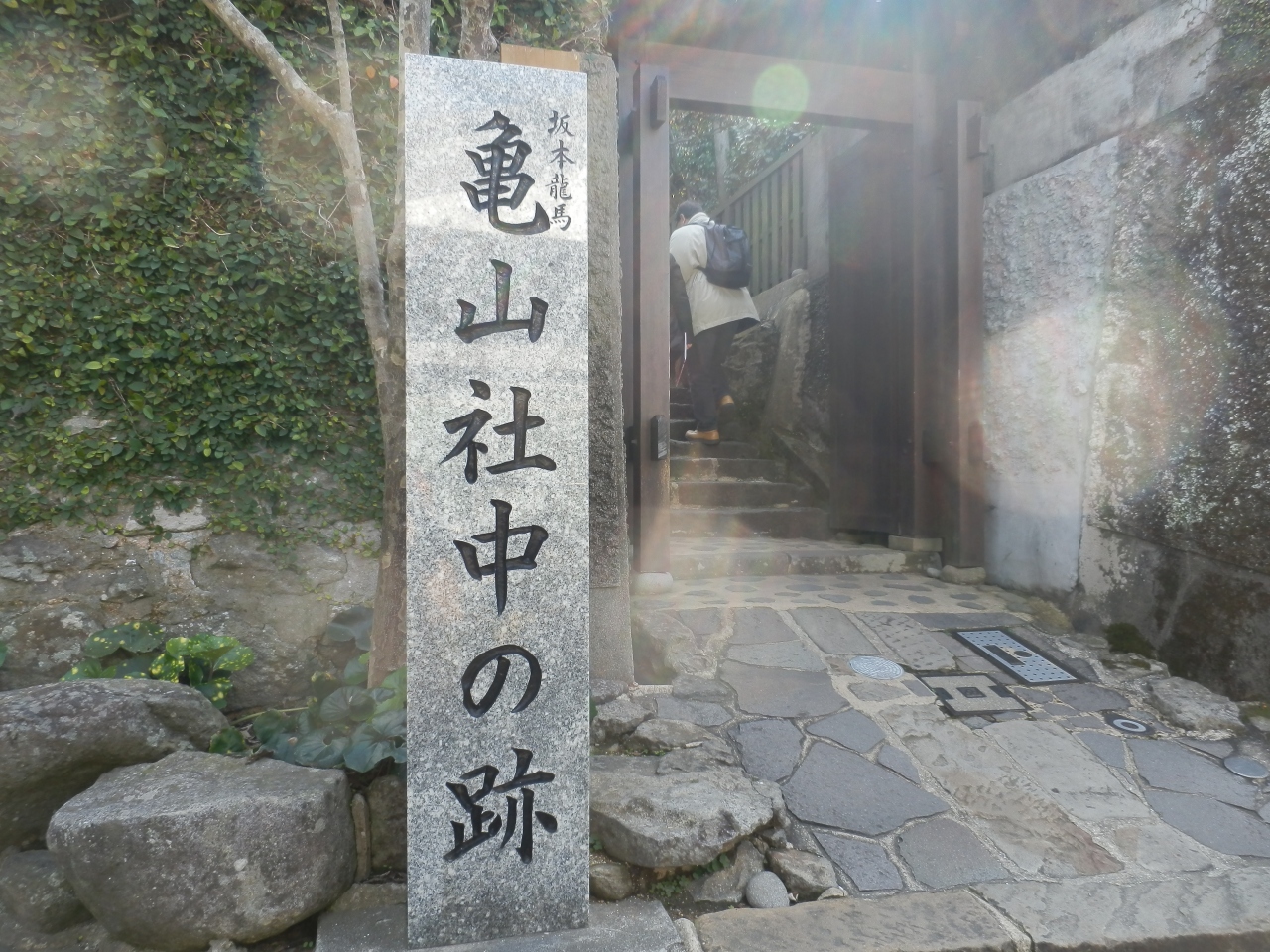 バスで風頭公園まで行き、竜馬の足跡をたどりながら、下っていくと、途中で亀山社中跡がある。ここには記念館があり、坂本龍馬の亀山社中の遺構として公開されています。幕末当時をそのまま復元され、坂本家の家紋が入った紋服やピストル、ブーツなどが飾られています。