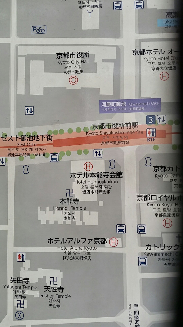 京都市役所の真ん前で、周りが背の高いビルに囲まれているのは少し残念な感じ、、、