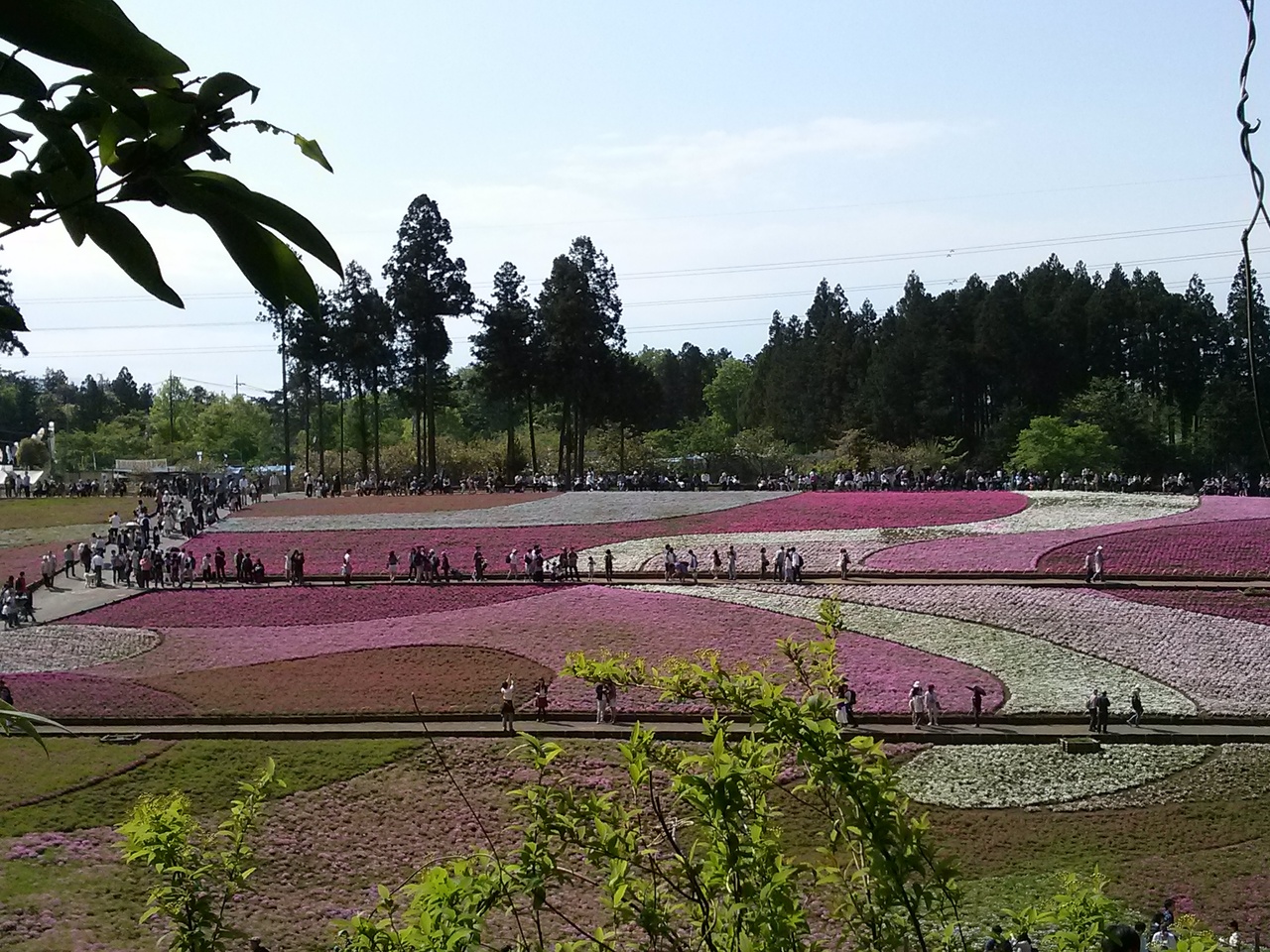 2016/4/30 ミューズパークからシャトルバスで羊山公園へ。バスを降りたら公園かと思いきや、前を見ると長蛇の列。GWのいい天気の日とあって、ものすごい人。急ぎたくてもみんな連なっているのでその流れにまかせ公園までの坂を登っていきました。歩くこと15分。テレビで見た芝桜で彩られた風景が目の前に広がりました。うーん、きれい!!右手の方は公園を見下ろすように休憩どころがあり、秩父のB級グルメ、みそポテトが美味しそう。