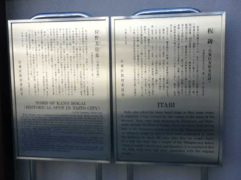 日暮里駅南西の臨済宗妙心寺派のお寺内にある。狩野芳崖は明治初期に活躍した日本画家で、不動明王図等の作品を著した。お墓は長安寺の墓地の中ほどにあり、死者の菩提を弔うため生前に自らの死後に備えて供養を行うため建立した塔婆の一種である板碑がある。狩野芳崖やこの界隈に関心や知識がある方は訪問するのもいいかもしれない。