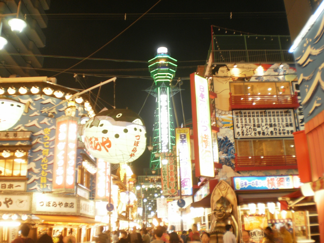 ゴールデンウィークに大阪地下鉄の恵美須町駅で降りて夜の新世界を散策しました。 通天閣はライトアップされて、飲食店の派手な飾りと明かりが綺麗でした。連休中だったので人が多く、長い列ができているお店もありました。 でも、どんどん南に行くと人通りが少ない感じでした。