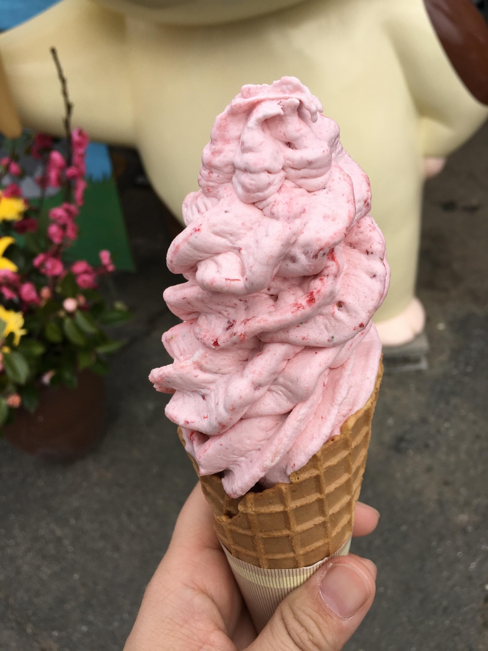 石舞台古墳観光の後に立ち寄りました。いろいろあるメニューの中からあすかルビーの果肉ソフト¥500を注文。冷凍されたイチゴをミキサーにかけて、ソフトクリームに混ぜているのかな。とにかく果肉感がたっぷりで美味しい!クセになる味でした。