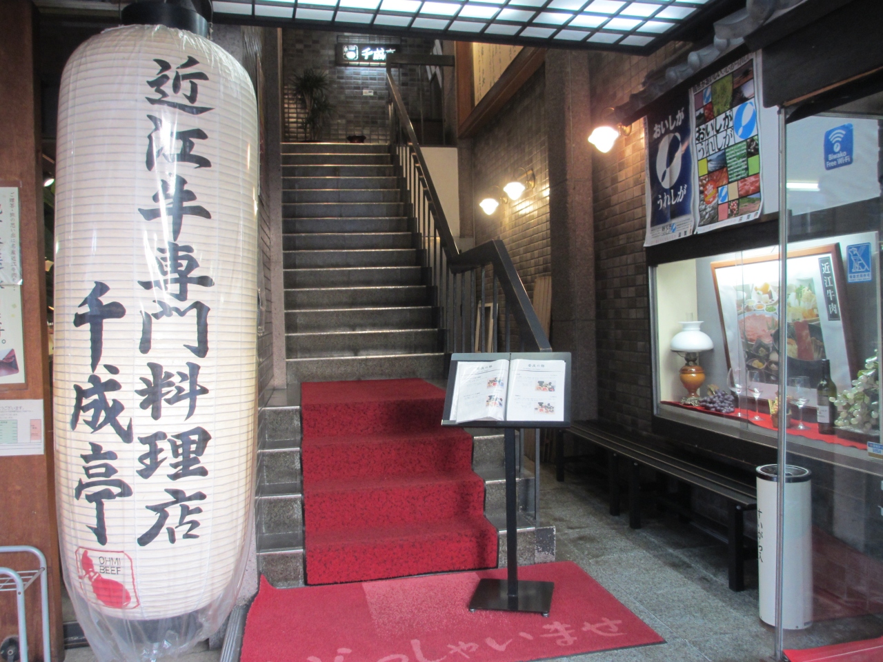 彦根駅から徒歩20分です。リバーサイド橋本通りにあります。近江牛のすき焼きが食べたくて、有名な千成亭のレストランへ行きました。連休明けの平日夜だったので、2階席には私たちだけでした。近江牛肉すき焼き御膳を注文しました。デザート以外全ての料理が同時に運ばれてきました。三種盛りや小鉢でゆっくりビールを飲んでから、すき焼きでご飯を食べようと思っていましたが、すぐ固形燃料に火をつけられたので割り下が煮詰まらないうちにすき焼きを食べることになりました。牛肉も割り下も美味しかったです。火をつけるタイミングを選ばせてもらえればもっと美味しくゆっくりと味わうことができたと思います。