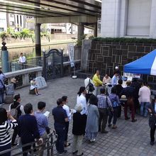 日本橋南詰め西側の橋の袂で、階段を数段降りたところに水が流れる人工の滝の壁に囲まれています。ここは江戸時代間口五間の小屋あり、罪人の晒し場だったそうです。日本橋クルーズの乗船場にもなっており、テントで受付を行っていました。すでに長い列ができており、外国人も多数並んでいました。