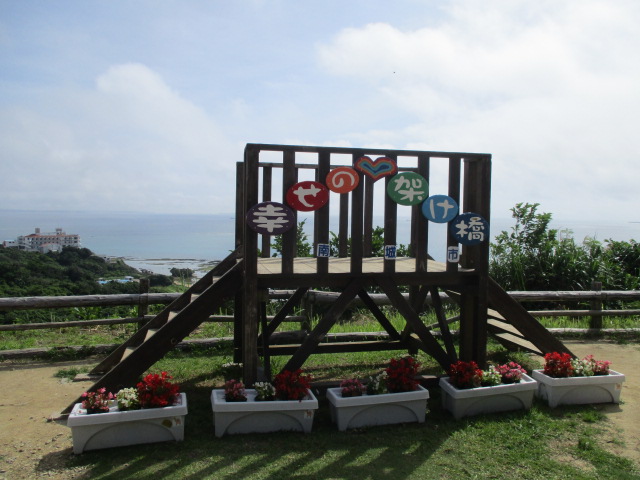 建物の前は広い駐車場です。幸せの架け橋は、遠景に海が見えるので、写真撮影によいです。久高島も見えます。