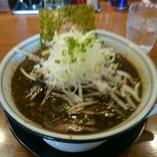 注文した期間限定の黒節担々麺は、黒胡麻スープで海苔の上に削り粉がたっぷりと乗っています。魚系のだしで辛みも少なく、ちょと変わった担々麺でした。餃子は大きく、味がじっかりついていて美味しかったです。店長らしき人のきびきびした動きと、お客様への声掛けが印象的でした。