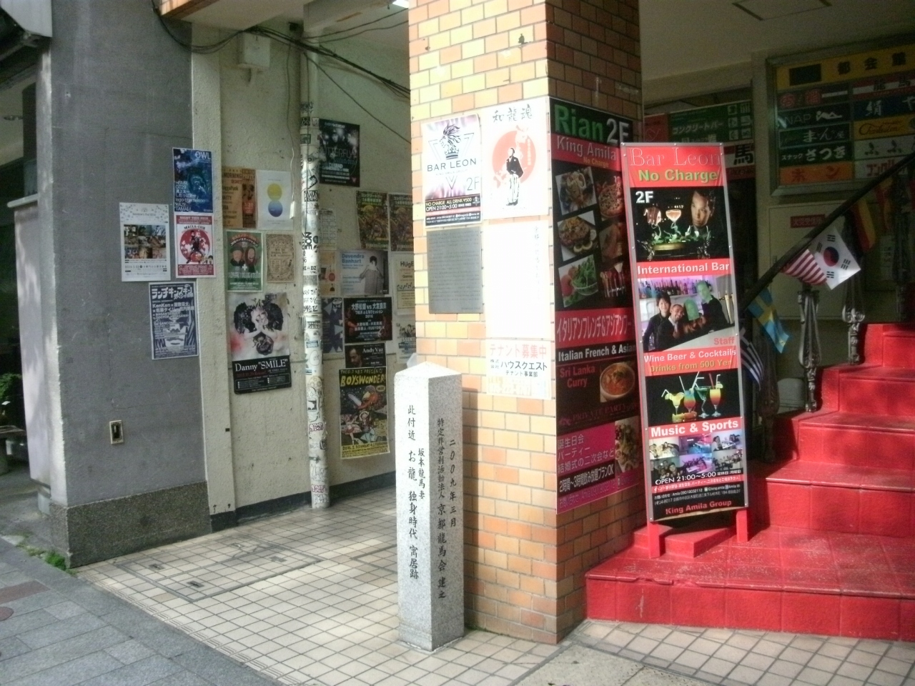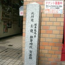 木屋町通りの高瀬川山崎橋東詰めを下がったところ、都会館“龍馬”前に「お龍 独身時代 寓居跡」の石碑が立っています。2009年3月に立てられた比較的新しい高さ1mほどの小さな石碑です。のちに龍馬の妻となるお龍が母や妹、弟たちとこの辺りに住んでいたそうで、正確な位置は不明なことから「此付近」という表示になっています。説明板もないし、石碑だけで特別観るようなものもありませんが、この辺り一帯には、竜馬に関する史跡がたくさんあるので、竜馬ファンは合わせて観て回ればよいでしょう。