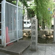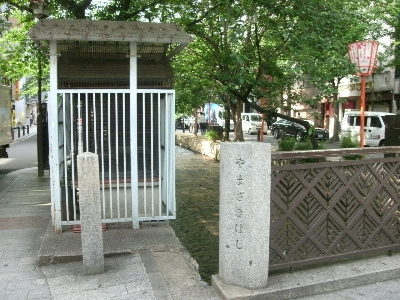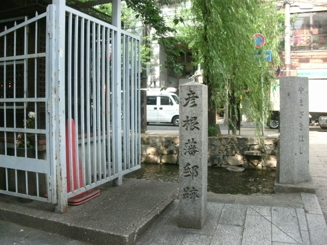 中京区木屋町通三条下る二筋目、高瀬川にかかる山崎橋西詰に「彦根藩邸跡」の石碑が立っています。江戸時代後期、彦根藩の京都における連絡事務所であったところで、藩邸の北側、南側ともに高瀬川の舟入(物の積み下ろしと舟の方向転換の場所)があったことから、水運の便の良いところに藩邸を設けたのでしょうか。現在は、石碑があるだけですが、この辺りは、土佐藩邸や加賀藩邸などの石碑もあって、坂本竜馬が暗殺された近江屋も近いので、幕末や歴史好きの方にはオススメの場所です。