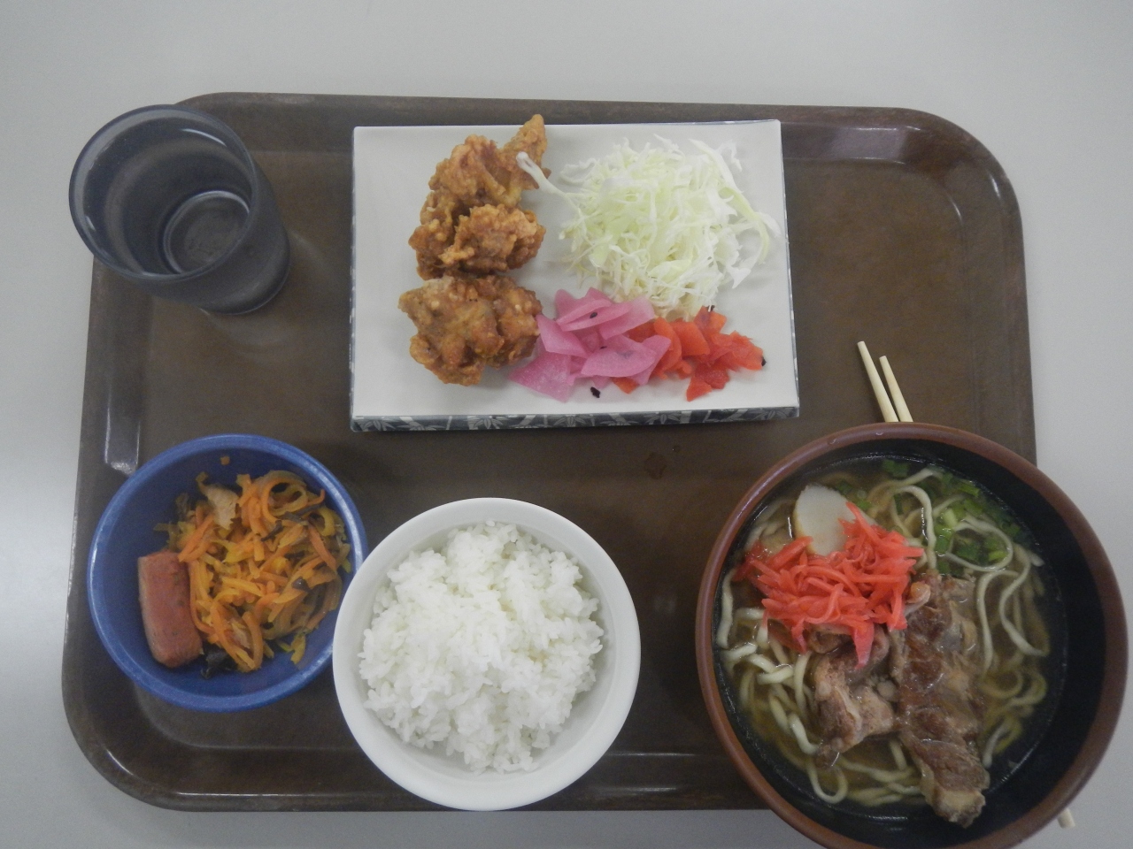 首里城の近くで食事をしようと思っていたら、大学の学食が目に入ったので、ここで食事をすることにした。メニューを眺めて、「沖縄そば定食」500円にした。食券を買い、食厨房に提出した。沖縄そば、唐揚げ、ご飯とおかず一品とボリュームがあったが、唐揚げは冷たいし、そばは麺の香りが変だった。やはり学食はこんなものかと思った。