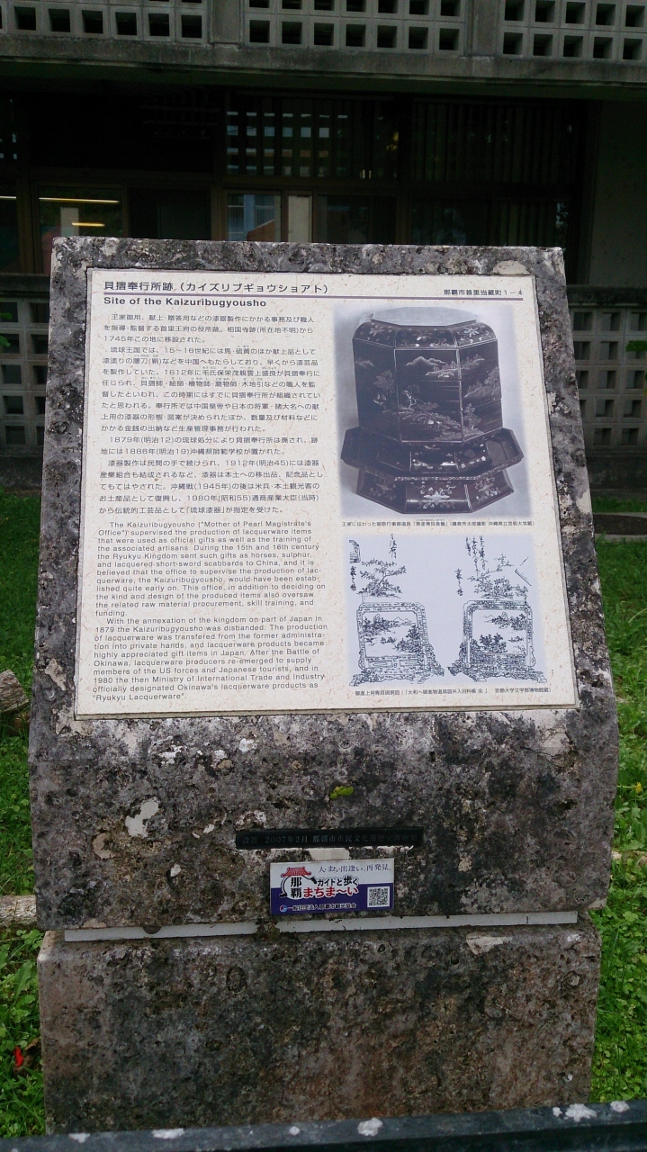 首里城公園を訪問し、その後、円鑑池側の方面からゆいレールの首里駅に向かって行く際に、沖縄県立芸術大学のところの道路際のところにあります。現在は説明板だけが設置されており、それ以外の史跡はなにもありません。そもそも、この地にあった貝摺奉行所は王家での御用、献上、贈答用に制作する漆器制作の事務や職人を指導・監督する首里王府の役所です。琉球から沖縄になった明治初頭に廃止されてしまいましたが、現在も琉球漆器として工芸品は残されています。