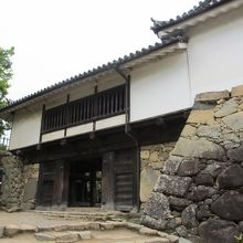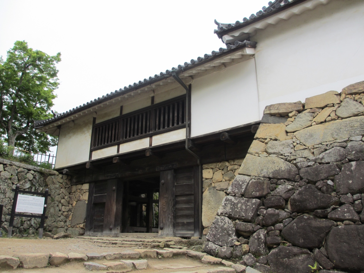 彦根城本丸へ入る最後の門、太鼓櫓です。門櫓の南にくの字に曲がった続櫓が付設されています。太鼓門櫓の背面は壁がなく柱の間に高欄をつけて廊下になっています。登城合図用の太鼓の音を響かせるために考えられたのではないかといわれています。築城時に他の場所から移築された建物です。昭和の解体修理調査で元の城は不明ですが、城の城門であったことが判明しました。元の城の城門が大きく、それを縮小して現在の太鼓門櫓としています。ガイドさんに縮小した痕跡を見せてもらいました。