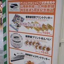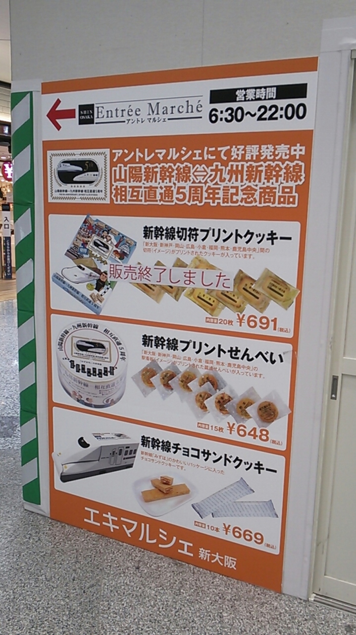 2016年5月21日現在、「アントレマルシェ」というところで新幹線プリントせんべい等山陽・九州新幹線相互直通5周年記念商品の販売が行われていますが、この日現在、既に一部の商品(新幹線プリントクッキー)は売り切れているそうです。