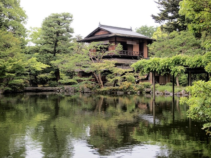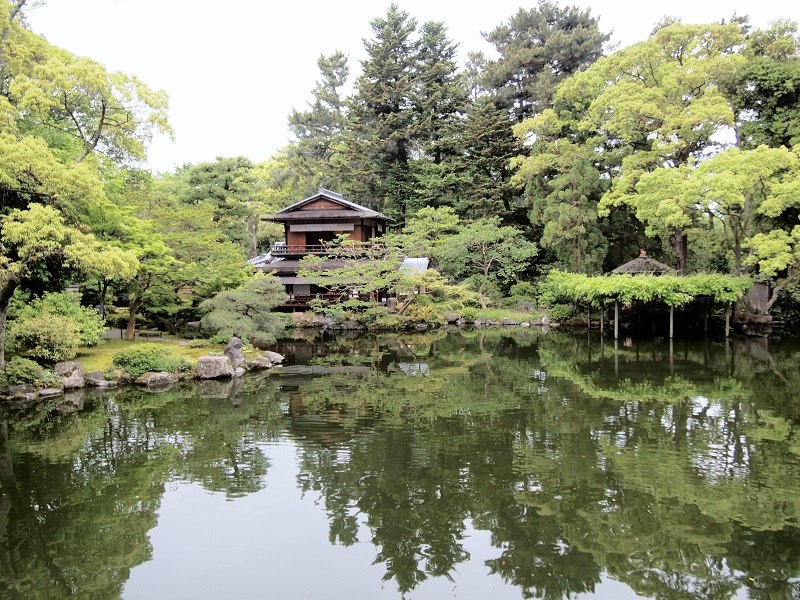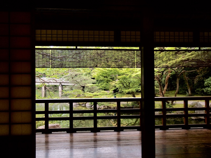 拾翠亭は、九條家の茶室として使われていた約200年前の建物です。九條池にかかる高倉橋からの眺めや、また少し角度を変えて、九條家の鎮守社であった厳島神社からの眺めも素晴らしいです。高倉橋を北側から渡り始めると、最初は後ろのビルが気になりますが、途中からはビルも見えなくなります。