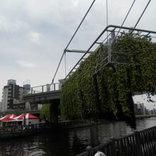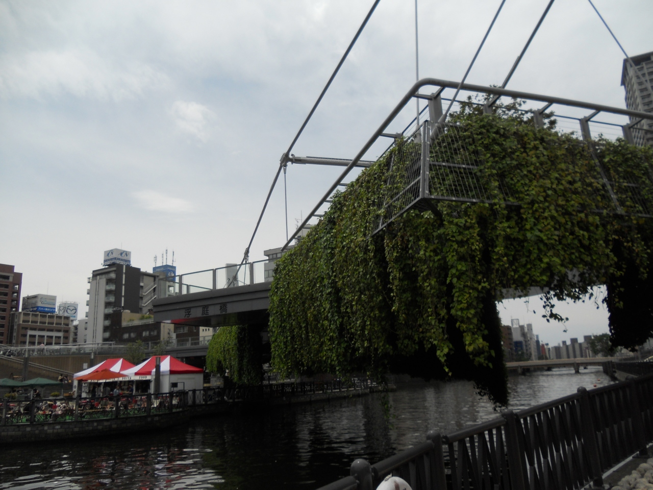 「浮庭橋」は、「キャナルテラス堀江」と対岸の「湊町リバープレイス」を結ぶ「道頓堀川」に架かる橋ですが、両岸の主塔からケーブルワイヤーで吊っている構造で、芝生やツタで緑化されているオブジェのような素敵な橋でした。