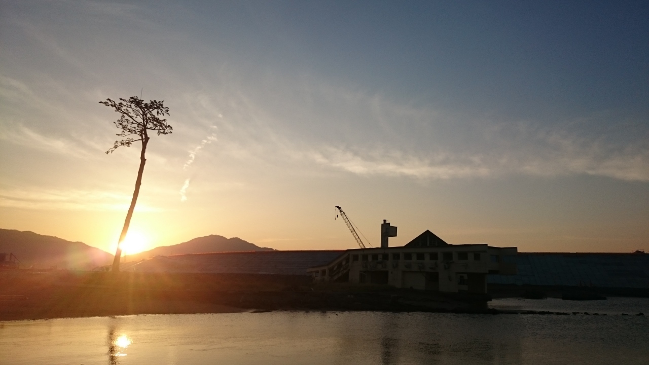 陸前高田のシンボルとなった場所です。500メートルほど離れた一本松茶屋の駐車場に車をとめ、そこから歩いていきました。ほかには誰もいない松のふもとで日の出を待っていると、山と山の中間から日が昇ってきました。無言で合掌。