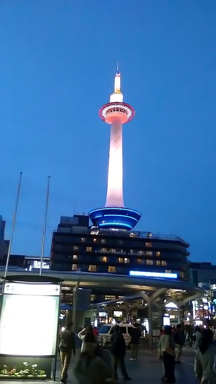 京都駅前すぐに見える京都タワー。京都のシンボル的存在なのかな。夕闇にライトアップされた姿が結構きれいでした。