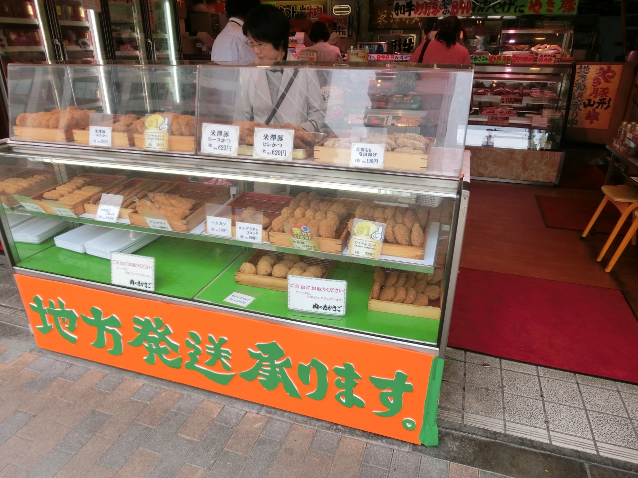 昼飯時になり、清澄通りを歩きながら飯どころを探していたら、相生橋の手前に大きな肉屋があり、コロッケ、チャーシュー、牛肉弁当などがショーケースに並んでいた。
