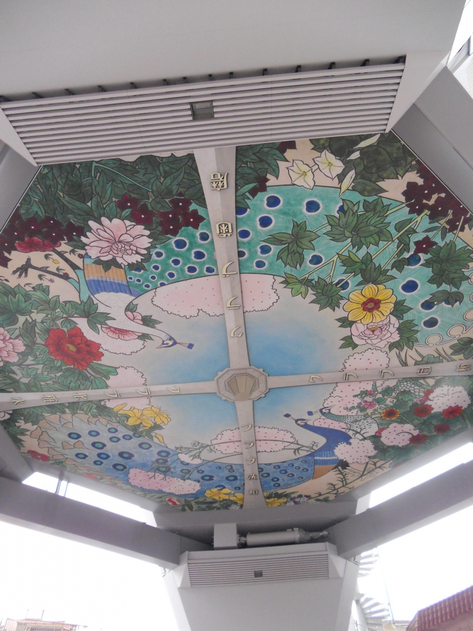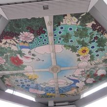 通天閣の下から上を見上げると、復刻されたクジャクの天井画も見ることができます。