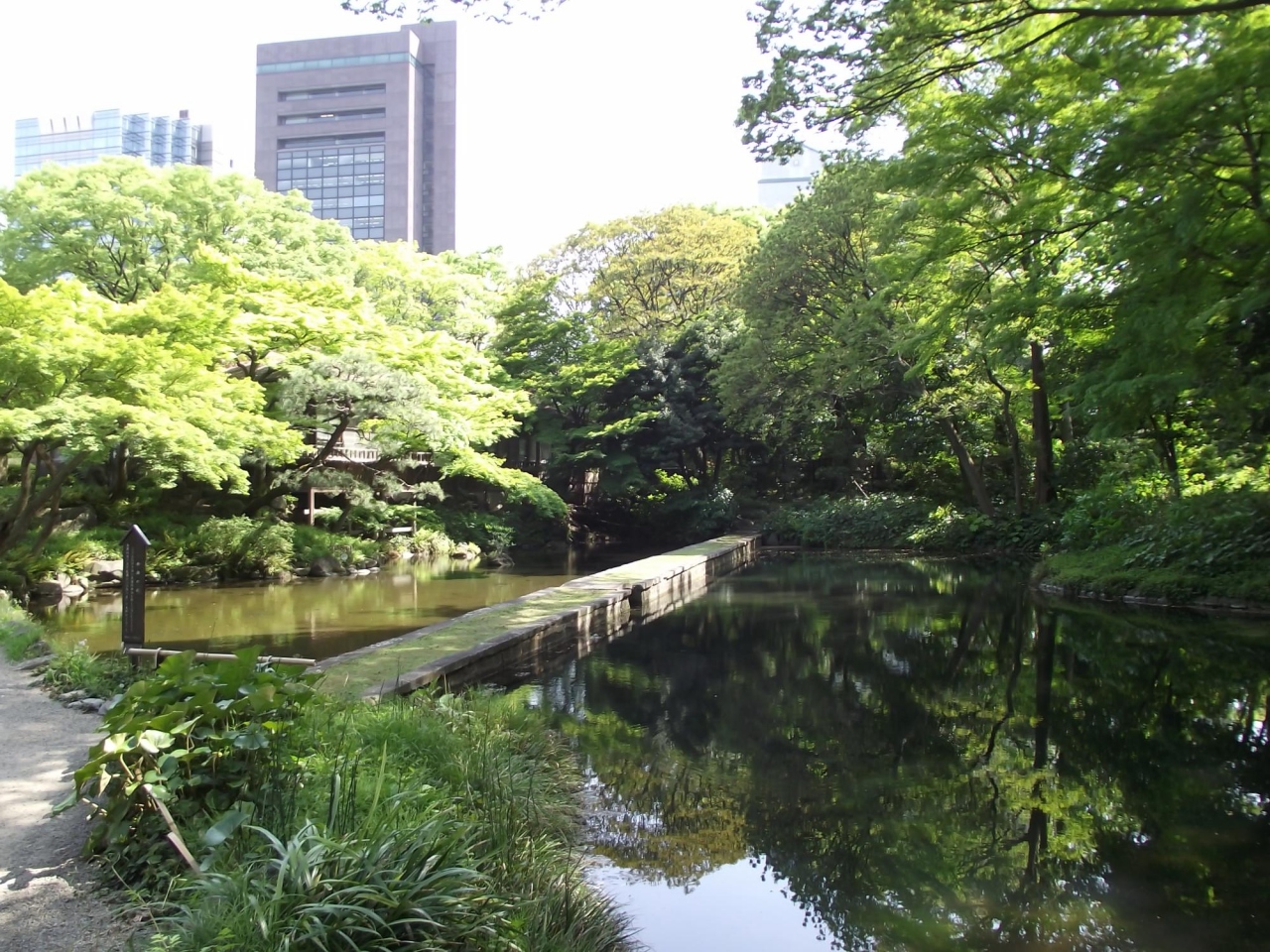 この石堤は中国の名勝地西湖を模して造られたもので、本園以後の大名庭園の 「西湖の堤」 の先駆けとなった とのこと。