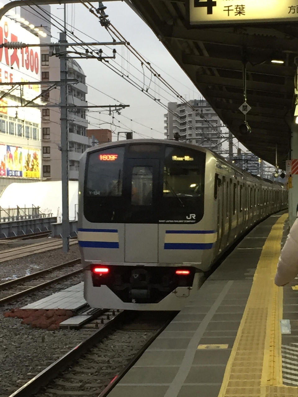黄色い電車が普通電車で、千葉から秋葉原、新宿を通って三鷹まで向かいます。