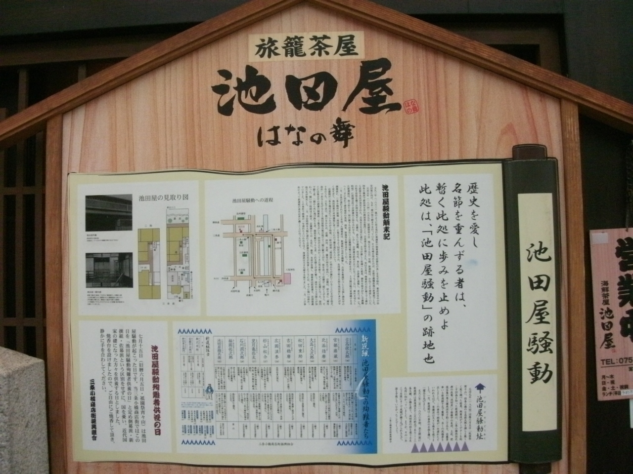 京阪三条駅から三条通りを西に歩いて3分ほど、高瀬川にかかる三条小橋を渡った先、右手に「池田屋騒動跡」の石碑があります。