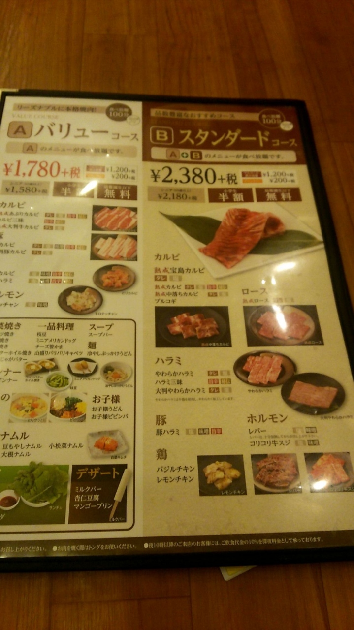 焼肉食べ放題のお店です。食べ放題にもいくつかのコースがあるようですが、スタンダードコース(2,380円税別)を注文しました。食べ放題メニューにある熟成宝島カルビや大判カルビはかなり大きくボリュームがあります。また、クッパ、ビビンバ(いずれもハーフサイズ)なども食べ放題メニューにあるのでシメにはちょうど良い量です。
