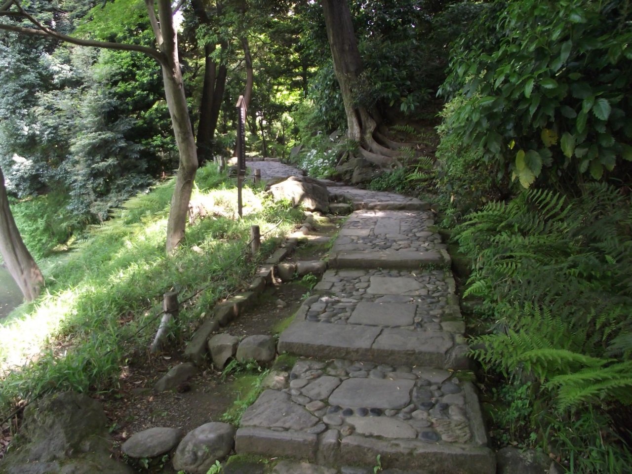 場所は、園内の南側なので入園して大泉水の右手 (南側) を東側に向かって徒歩2分位で延段の西端に着きます。