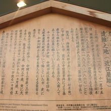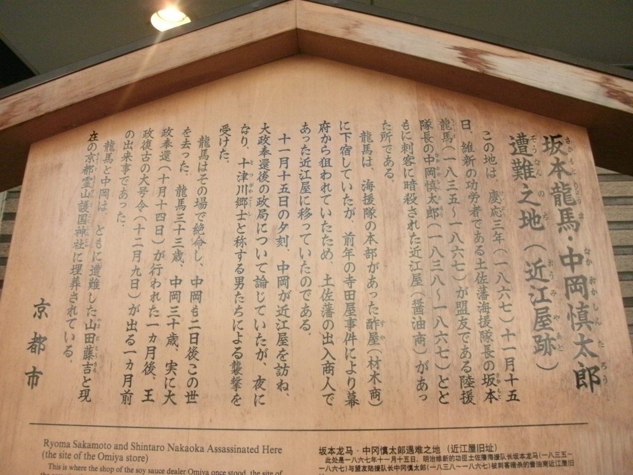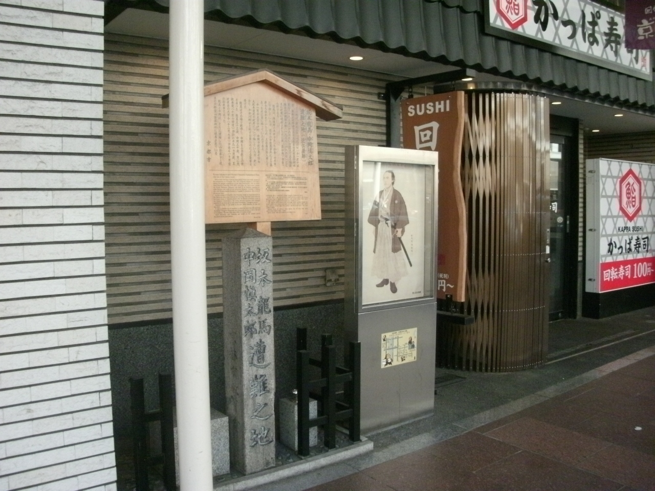 阪急電車の四条河原町駅から河原町通りを北に3分ほど歩いた、通りの西側に「坂本龍馬中岡慎太郎遭難之地」の石碑があります。坂本龍馬と中岡慎太郎の両者が暗殺された近江屋があったところです。石碑と説明板があるだけで、当時の様子をうかがわせるものは何も残っていなくて残念ですが、龍馬ファンなら必ず訪れたいところです。周辺には、池田屋跡や土佐藩邸跡、お龍寓居跡、岬神社(土佐稲荷)など竜馬にかかわる史跡がたくさんあるので、合わせて観て回ればよいでしょう。すぐ近くに、京都交通観光案内所があります。