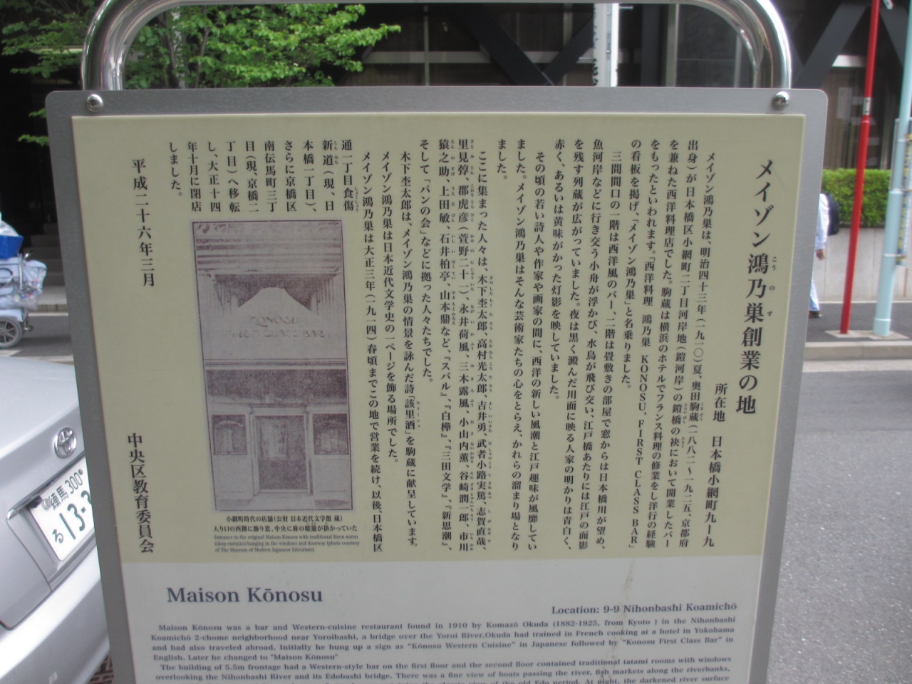 小網町安田ビルの前に中央区教育委員会が設置した説明板があります。メイゾン鴻乃巣は奥田駒蔵という人物が、1910年に開業したバーを兼ねた西洋料理店で、武者小路実篤や志賀直哉や永井荷風といった文士が集まったそうです。近代文学史がお好きな方は訪れてみてはいかがでしょうか。